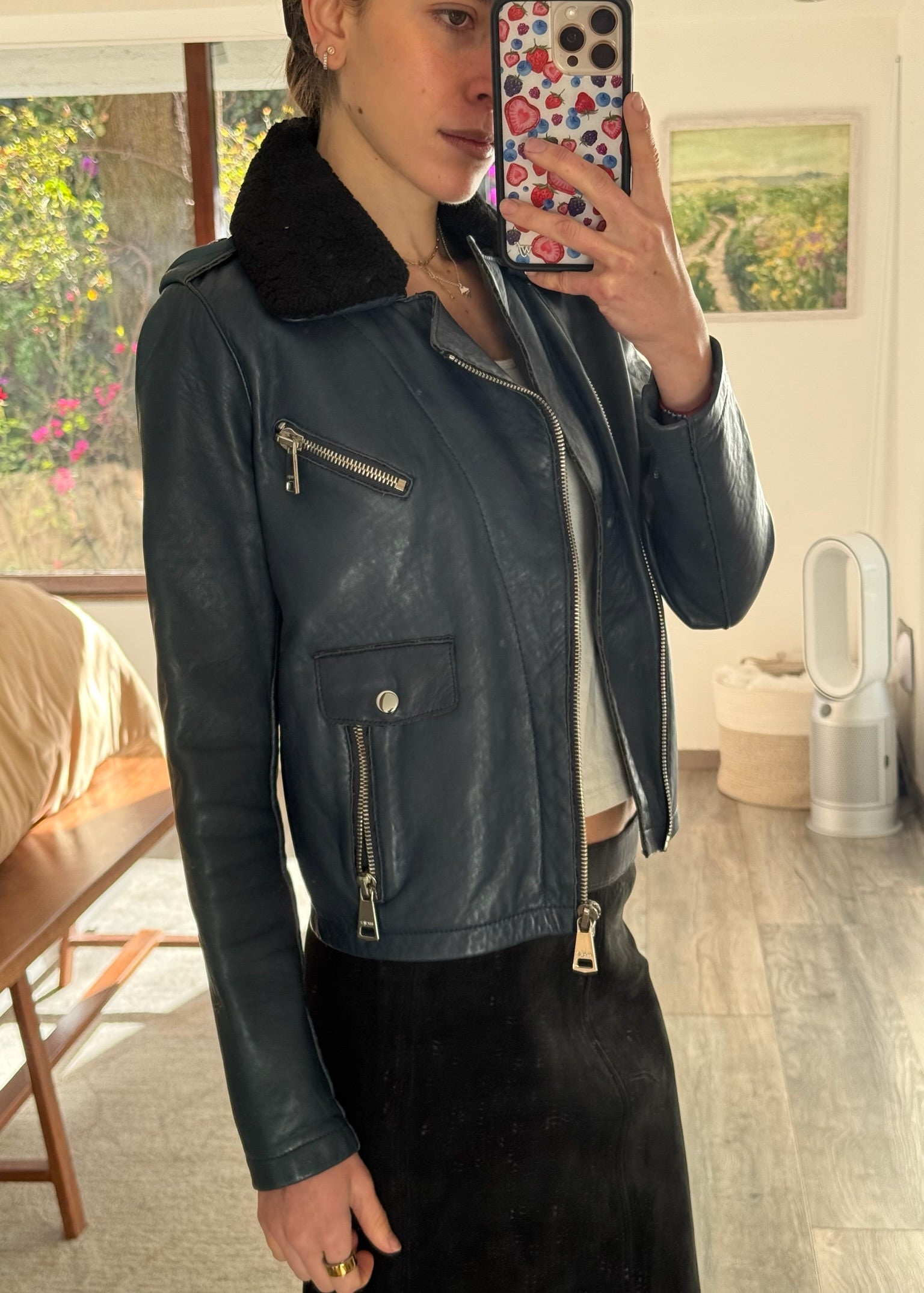 CHAMARRA DE PIEL CON FUR AZUL